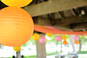 The draped fabric and hanging lanterns in the chosen colors created a vibrant atmosphere in the pavilion and instantly transformed the bland structure into a colorful area fit for a summer gathering.